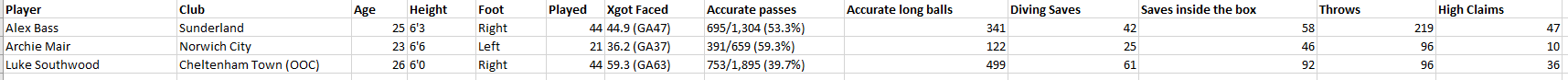 xGOT is the expected number of goals a goalkeeper is expected to concede, based on the chances the opposition team have against him. So if your goals conceded is lower than the xGOT, you've done a good job. If the numbers are close, as shown by the xGOT faced of Alex Bass, Archie Mair and Luke Southwood, then it's ok and says more about the defence. If the goals conceded is higher than the xGOT, well that's just bad.