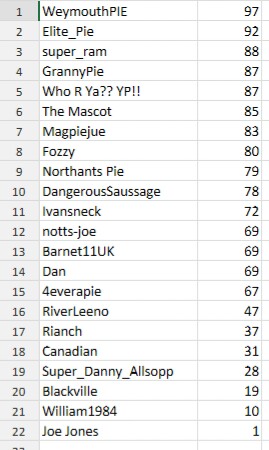 Canadian, Dan, Northants Pie, The Mascot, 4everapie, GrannyPie, super_ram & Fozzy - 3 points