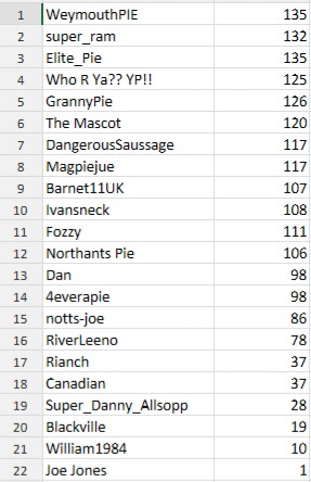 WeymouthPIE, Ivansneck, The Mascot, 4everapie, Dan & super_ram - 2 points