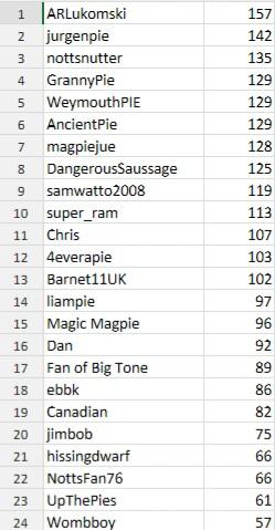 Weymouthpie, liampie, ancientpie, magpiejue, nottsnutter, super_ram & barnet11uk - 3 points